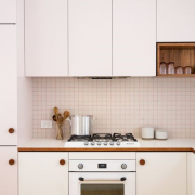 - صورتی زیبا: برای این آشپزخانه بازسازی شده نیمه قرن بیستم در استرالیا، تیم طراحی “Space Craft Joinery” کابینهای رنگ سفید پایین را با کابینتهای بالای ورقه Polyrey صورتی به نام گلبرگ رز ترکیب کردند که چشم را نوازش می دهد. این ترکیب سفید و صورتی در کاشی زمینه (backsplash) تکرار شده.